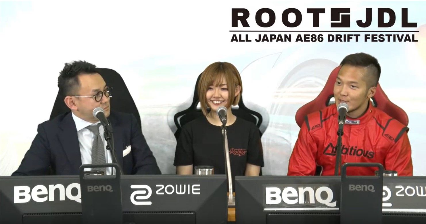 今回のROOTSJDL CHAMPION FESTIVALはスペシャルアンバサダーの土屋圭市氏を筆頭に、ROOTSではお馴染みの顔となったMC・実況に北川義明氏、ゲストにチョコブランカ氏をお呼びしました。出場選手は全部で8名、eスポーツゲーマー枠からやまどぅー選手、カルソニック選手、ふじお選手。プロレーサー枠から久保凛太朗選手、新井大輝選手。声優の紅音さん、ゲスト枠でTEC-ART’S鎌田社長の甥っ子の鎌田司氏。そして、チョコブランカ氏の8名で戦った。