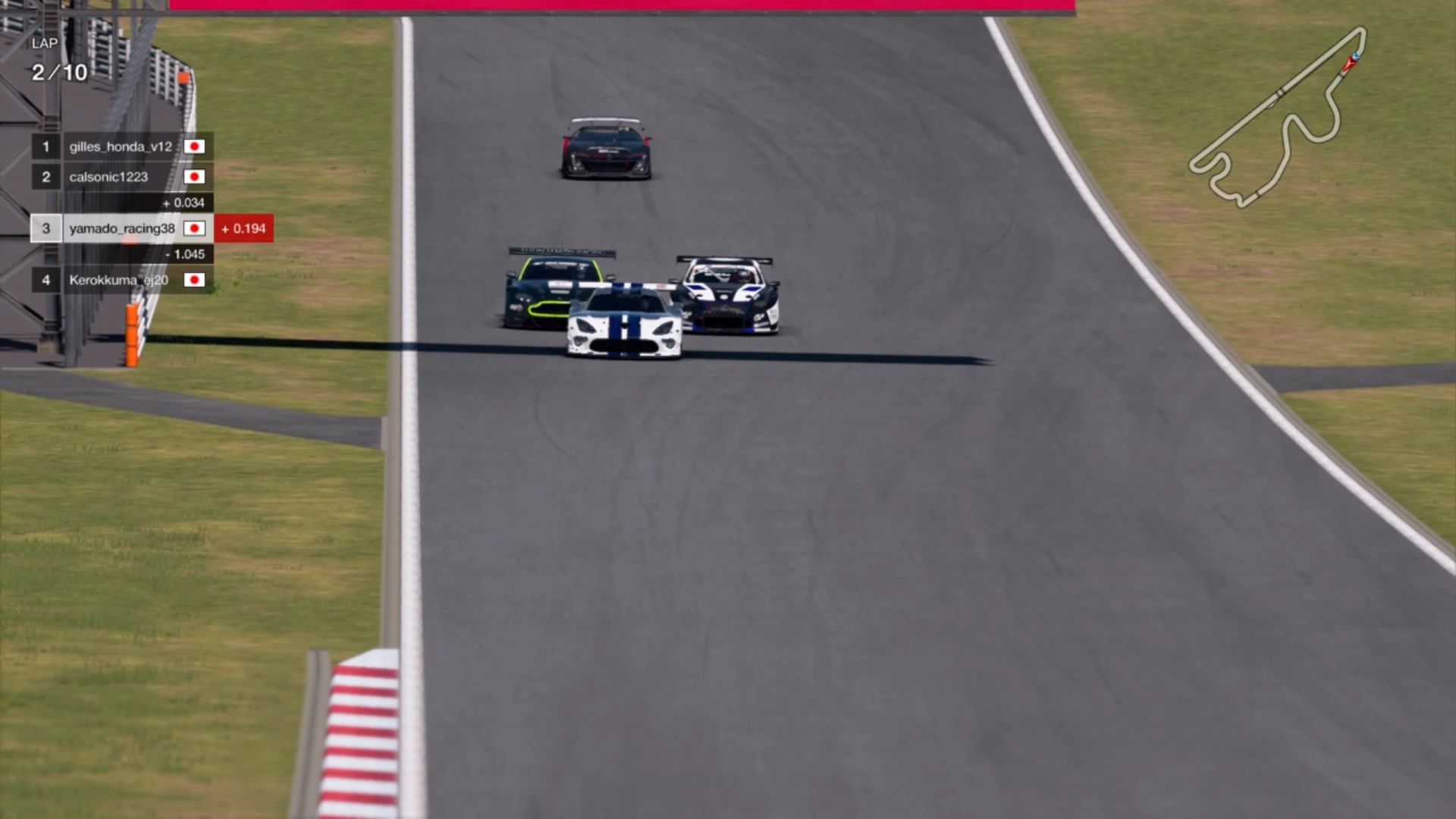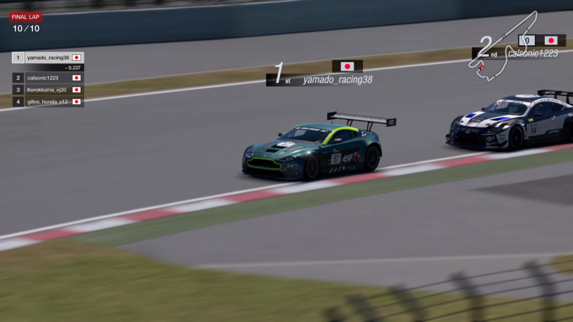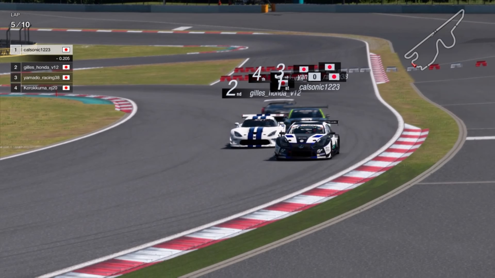 やまどぅー選手・ふじお選手ペアはピットアウトすると4位に後退するが、すぐさまけろっくま選手をオーバーテイク、そして8周目にタイヤの摩耗に苦しみ始めた龍選手をパスし2番手に浮上。1.6秒前のくろみ選手を捉えるべく残り2周を全開で富士スピードウェイ攻め始める。