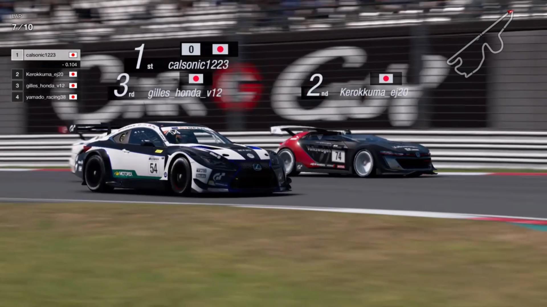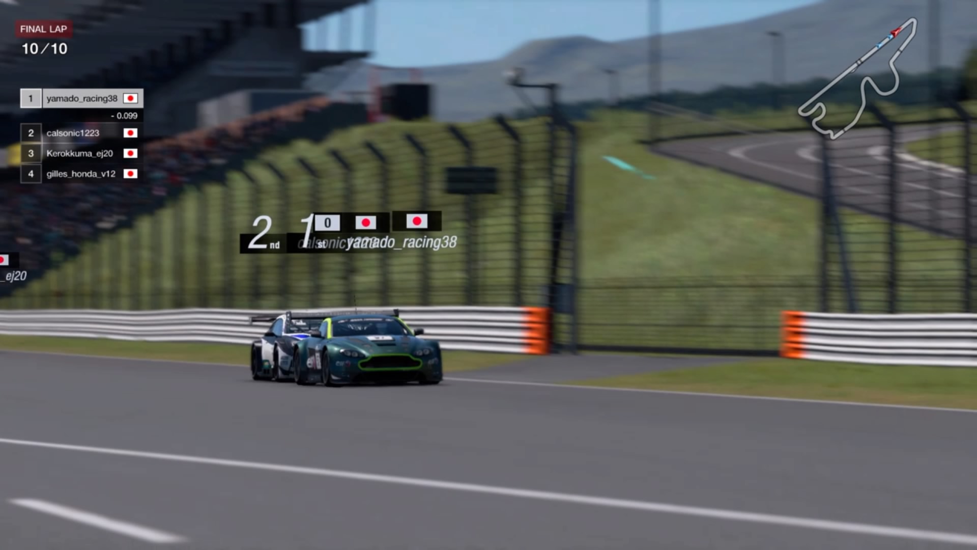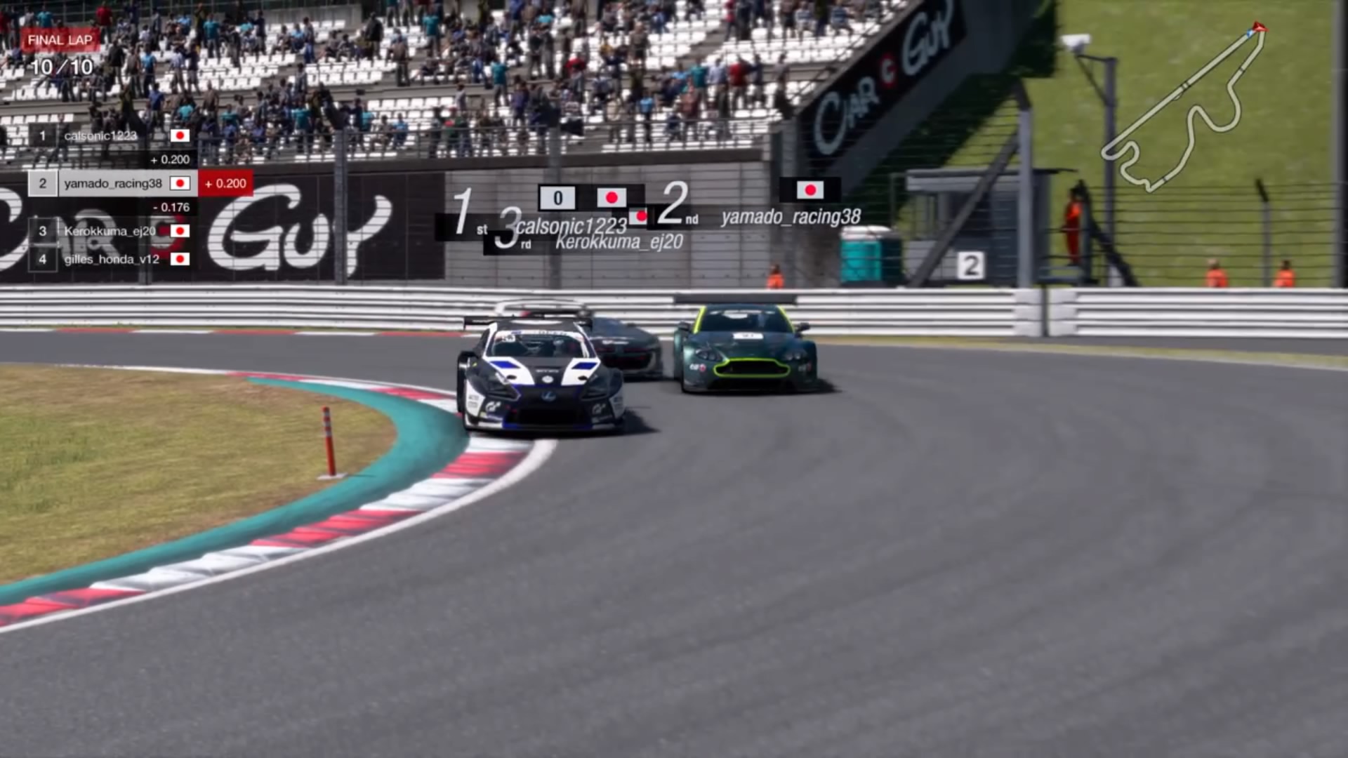 1.6秒差を取り返したやまどぅー選手はファイナルラップのホームストレートでやまどぅー選手は遂にトップくろみ選手を捉え前に出るも、後ろから追い上げていたけろっくま選手と1コーナーで接触し、2位後退。