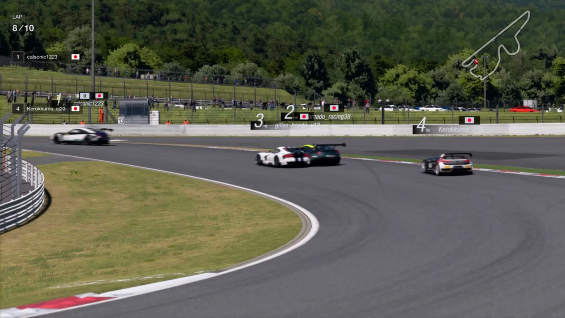 そしてレーススタート。順調なスタートを決めたふじお選手はトップを走るも、3番手スタートのかるそにっく選手が2周目のホームストレートでトップに立つも、ほんだ選手がバトルの隙を突き、トップへ。ふじお選手は3番手までダウンしてしまう。