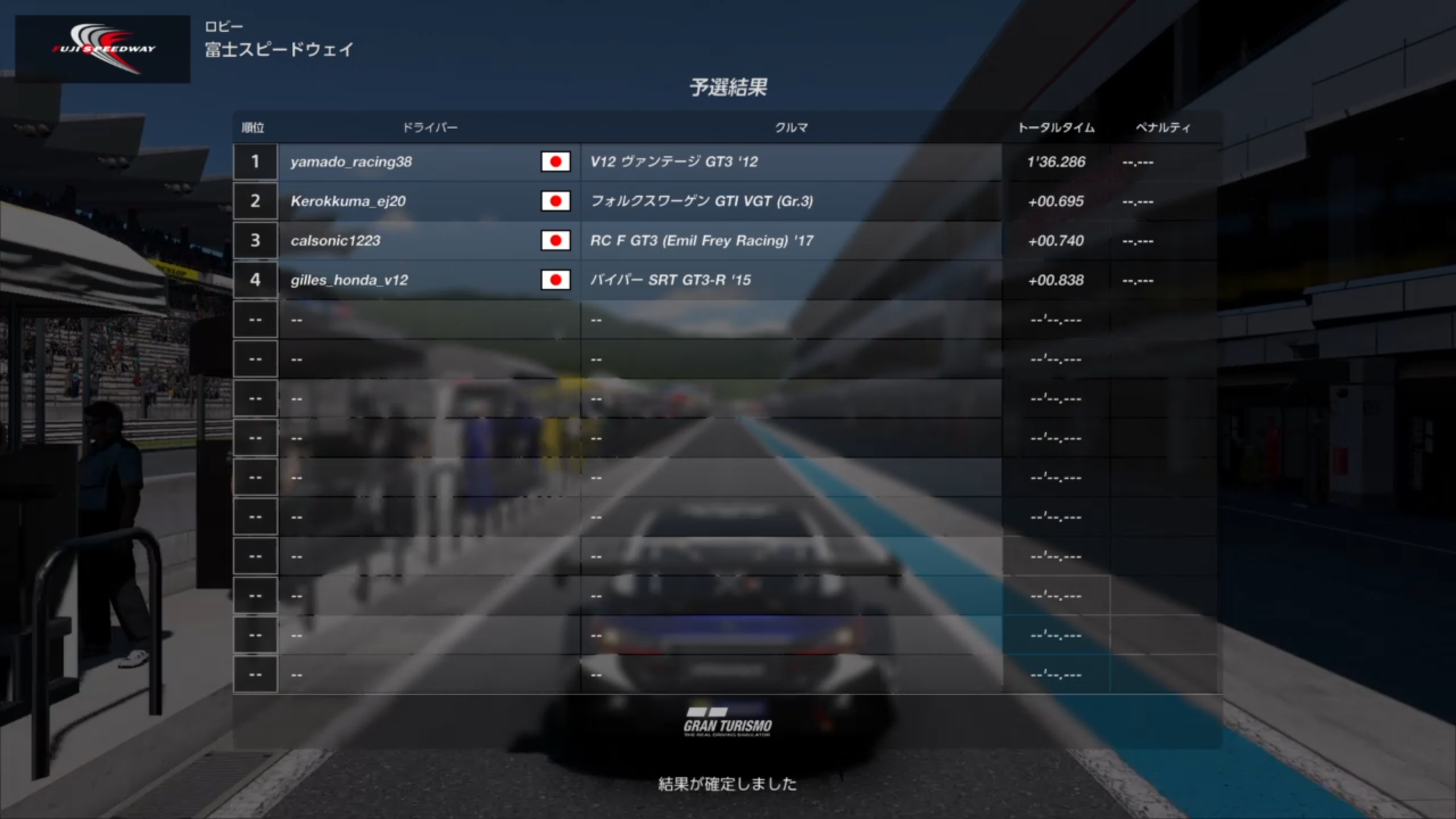 予選トップ通過したのは、2019年の「FIAグランツーリスモチャンピオンシップ 」のメーカー別対抗戦「マニュファクチャラーシリーズ」にて見事ワールドチャンピオンを得たやまどぅー選手。2番手には2020年の「FIAグランツーリスモチャンピオンシップ 」で ネイションズカップ 優勝を獲得したけろっくま選手。3番手には「ROOTS JAPAN CUP FINAL 2019」で2位のくろみ選手が付いた。