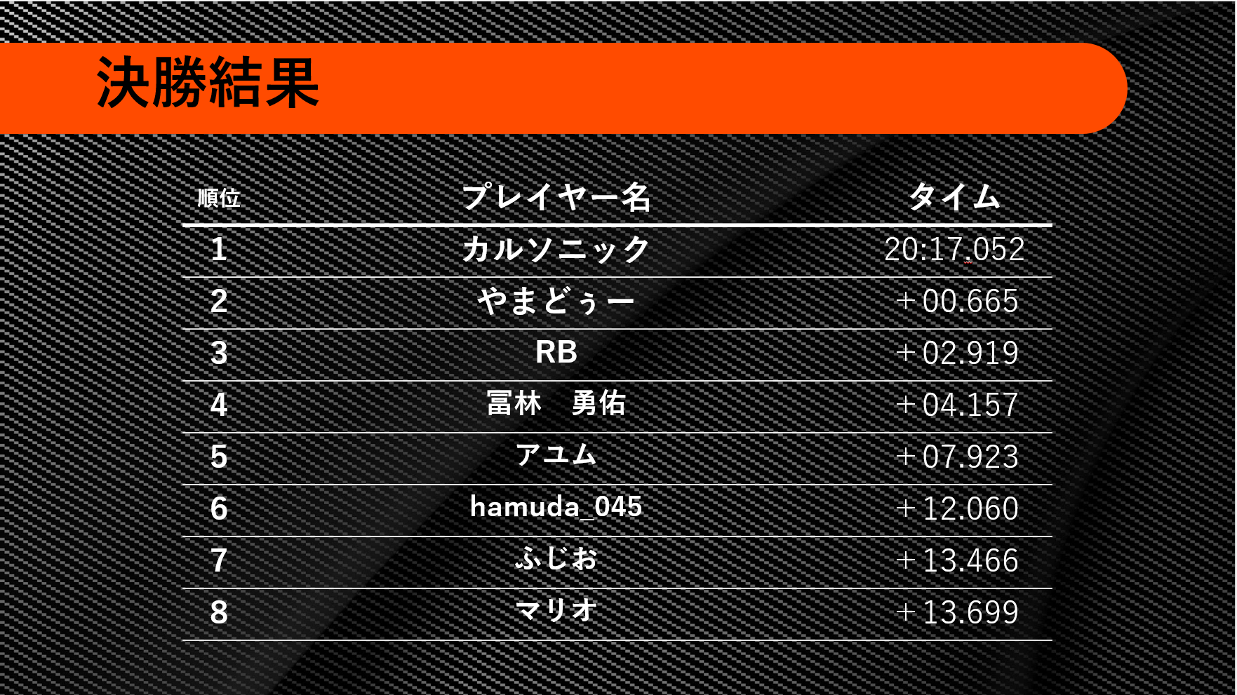 | 順位 | プレイヤー名 | クルマ | タイム | 1位との差 |